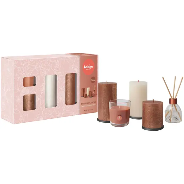 Gift set Large Cozy Hideaway. Deze set kaarsen bestaat uit 5 verschillende artikelen. Een geur van appel en kaneel en de bijbehorende kaarsen.